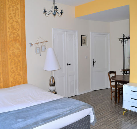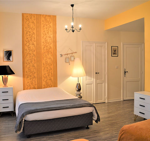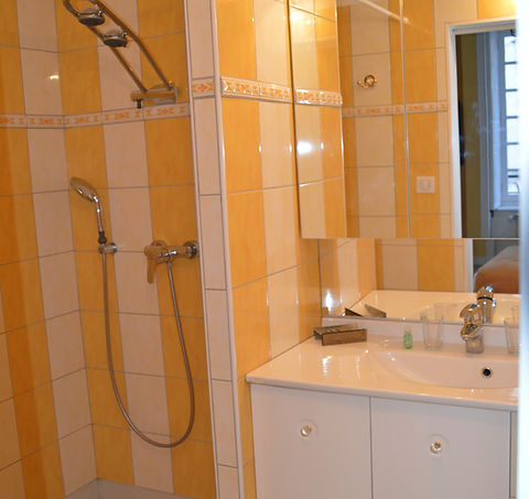 Vaste chambre pour 4 personnes, équipée d'un lit 140 et 2 lits 90, équipée d'une salle de bain privée avec douche à l'italienne et WC. Un sèche cheveux est à disposition et le linge de toilette est fourni.